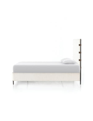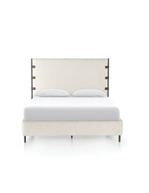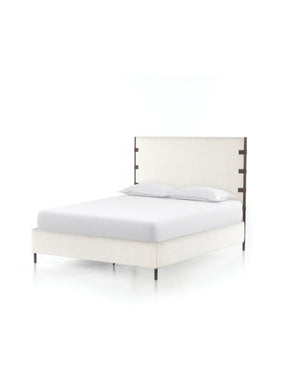 Bring texture into play. Upholstered in a classic cream-colored boucle, with decorative leather straps adding a material-driven touch with contrast. Standard box spring recommended.