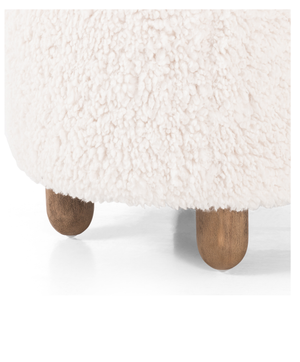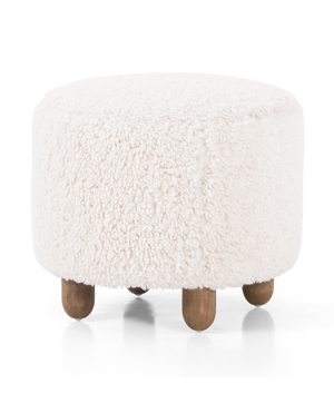 Place this round ottoman just about anywhere for a subtle retro vibe. Upholstered in a faux Mongolian shearling with a high pile fur. Parawood legs are wirebrushed for a warm, vintage feel.