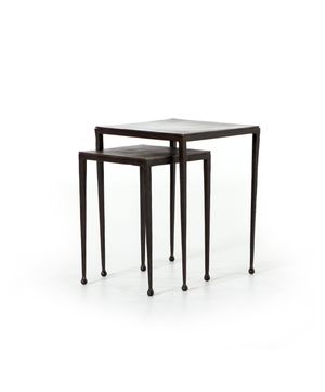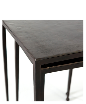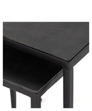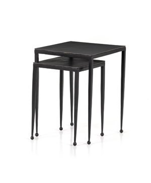 Tapered legs with rounded feet bring balanced footing to streamlined shaping. Aluminum tops are squared-off and finished in a sleek raw black. Large nesting table measures 16"W x 21.25"H. Small table measures 12.5"W x 18.25"H.