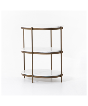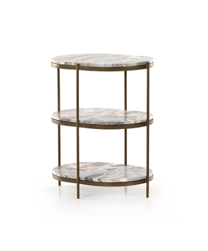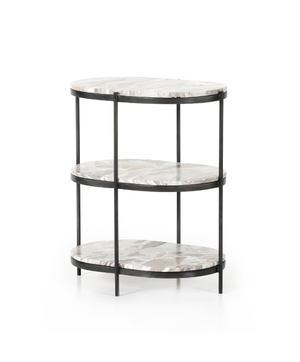 Add a pop of sophistication to any space. Polished white marble lays three tiers of oval-shaped shelving, with powder-coated grey iron framing bringing a feminine feel to bedside storage.