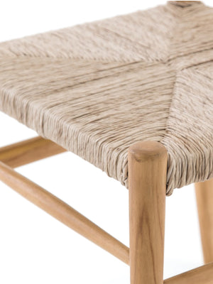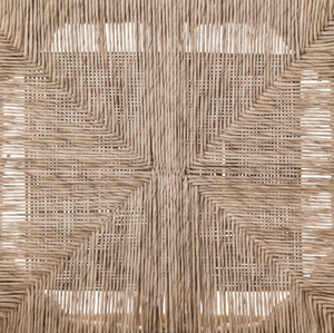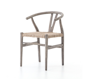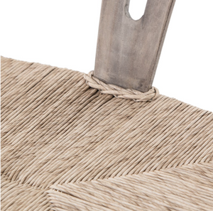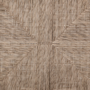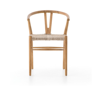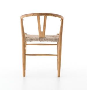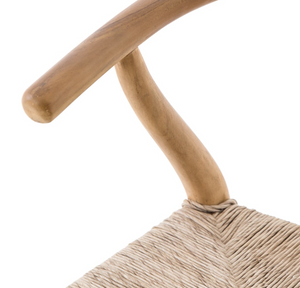Modern curves redefine classic wishbone seating. Vintage white all-weather wicker is woven for a dose of fresh texture against a neutral frame of natural teak. Cover or store indoors during inclement weather and when not in use.