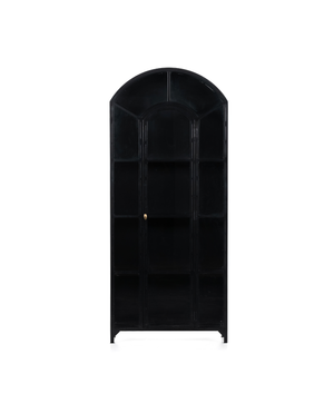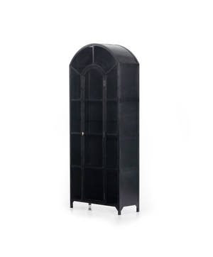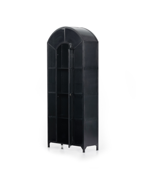 Display books, barware and other treasures in an arched cabinet with a glass pane detailed door. Solid iron is finished in soft, matte black with contrasting brass hardware.