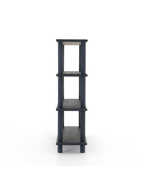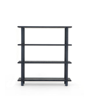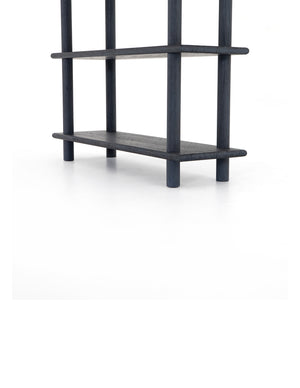 Modernist vibes meet Seventies styling. Wide, dark planks of indigo-washed oak veneer stack for stately presence, ready to store and show-off favorite books and treasures. Cylindrical rubber wood dowel supports and bullnose edging disperse softness throughout, for a perfect balance of feeling and scale.