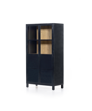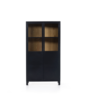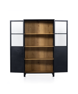 Black-finished casing forms elegant cabinetry. Clear glass doors reveal interior shelving and back paneling of light oak veneer, for a great contrast of color.