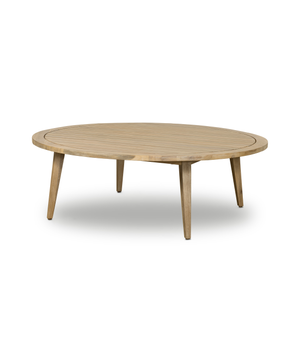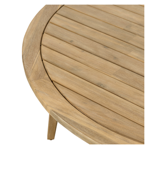 Simple and sleek, this outdoor dining table channels a transitional design crafted from solid FSC®-certified acacia. The round shape is constructed by slats showcasing natural knots and graining, finished by tapered legs. Cover or store indoors during inclement weather and when not in use.