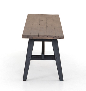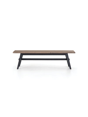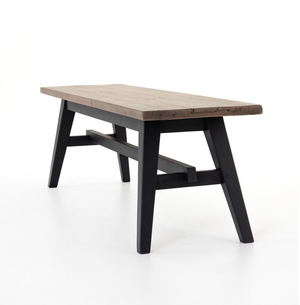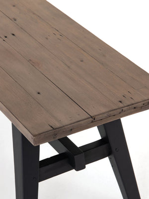 With splayed black legs and rectangular top of reclaimed pine finished in a sundried ash, generous sizing makes this bench-style seating the perfect pick for dinner parties.