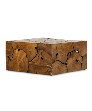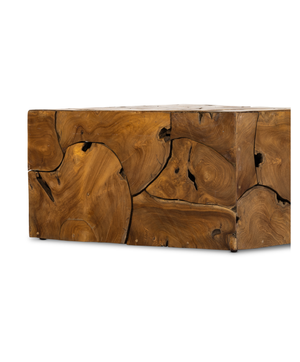 A unique layering piece — indoors or out. Made from laminated teak root with miter joinery, a simply shaped bunching table offers organic vibes and plenty of natural movement. Reflective or natural materials, tables will vary from piece to piece. Joint expansion may grow visible over time. Cover or store indoors during inclement weather and when not in use.