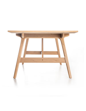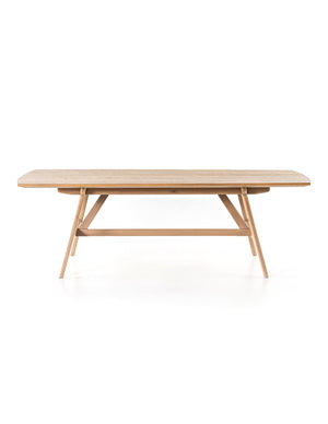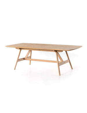 A boat-shaped dining table of beautifully burnished oak borrows inspiration from mid-century décor, while a tapered base and angled stretchers add a freshly refined touch.