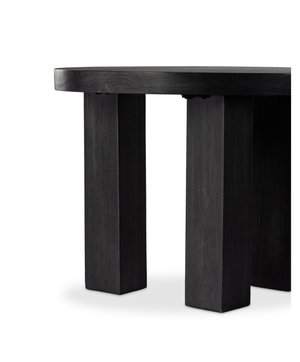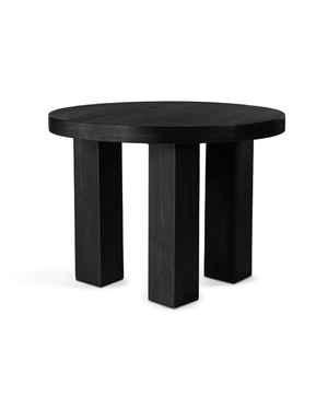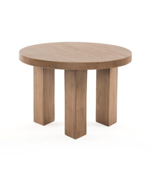The perfect place to keep a drink or book within reach, light-brushed parawood forms a rounded tabletop, with thick, triangular pedestal legs inspired by modern European design.